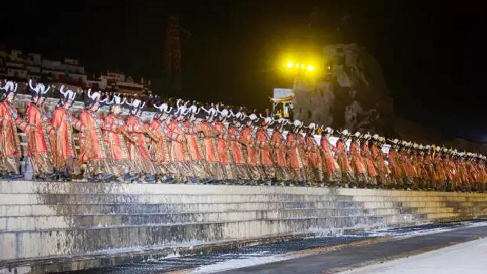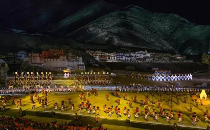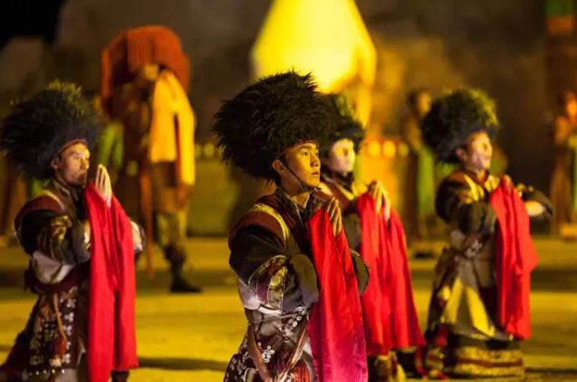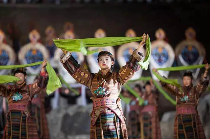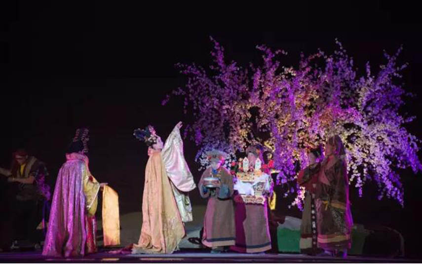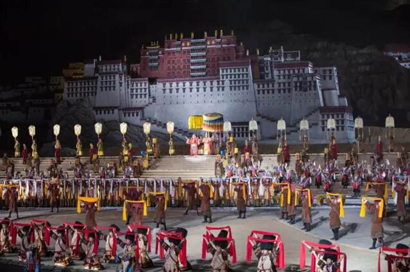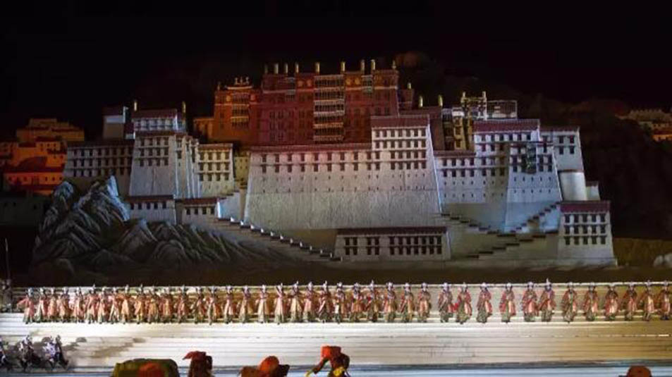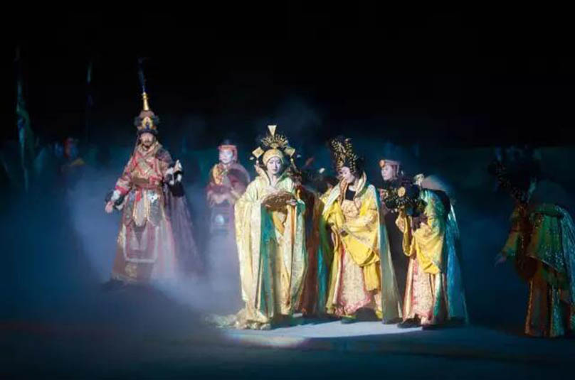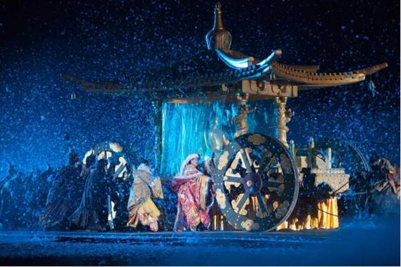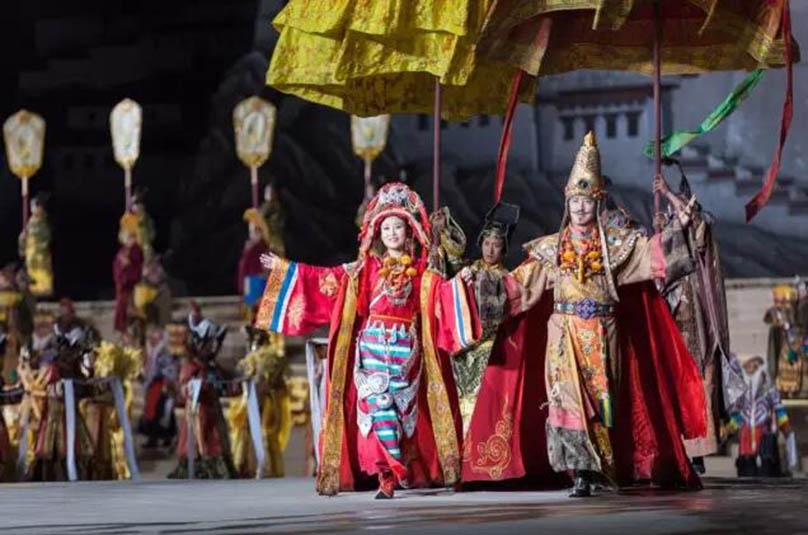 大型藏族實景劇《文成公主》主要講述文成公主入藏歷經艱難的征途和曲折起伏的心路歷程,演繹大唐盛世的愛情傳奇,傳唱漢藏和美的動人史歌。該作品分為“大唐之韻”、“天地梵音”、“藏舞大美”、“藏舞大美”及“藏舞大美”五幕,深度融入漢藏歷史文化、民族風俗、自然景觀等,引入了大唐歌舞和流傳久遠的藏舞、藏戲、佛號念唱等,通過人工舞臺與自然山水的結合,用高科技的手段呈現非物質文化遺產,把戲劇、音樂、舞蹈和現代舞美手段融為一爐,構成華美樂章。