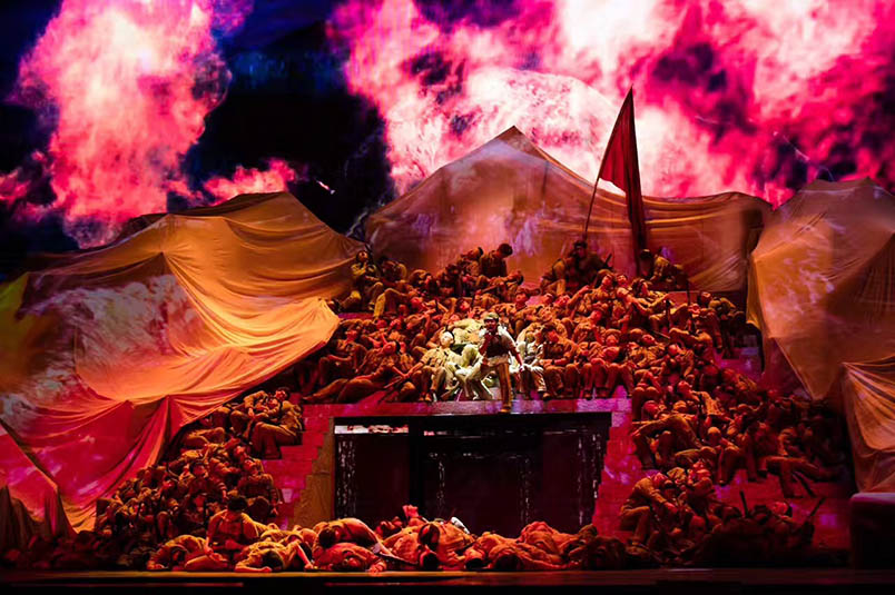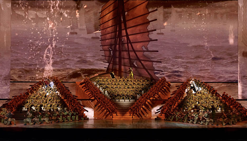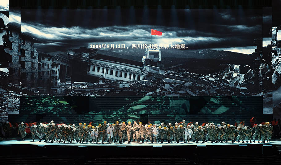 舞臺上舞美布景與燈光、視頻、投影等舞臺視覺形式的有機融合是晚會的亮點與難點。如此豪邁氣概的演出得益于晚會陣容強大的幕后團隊:總導(dǎo)演楊笑陽、舞美總設(shè)計孫天衛(wèi)、燈光總設(shè)計沙曉嵐、音頻總設(shè)計何飚再加上其他行業(yè)精英成員強強聯(lián)合,以舞美、燈光、音響、投影、視頻、舞臺機械等多種舞臺手段,呈現(xiàn)出恢弘壯麗的舞臺效果。