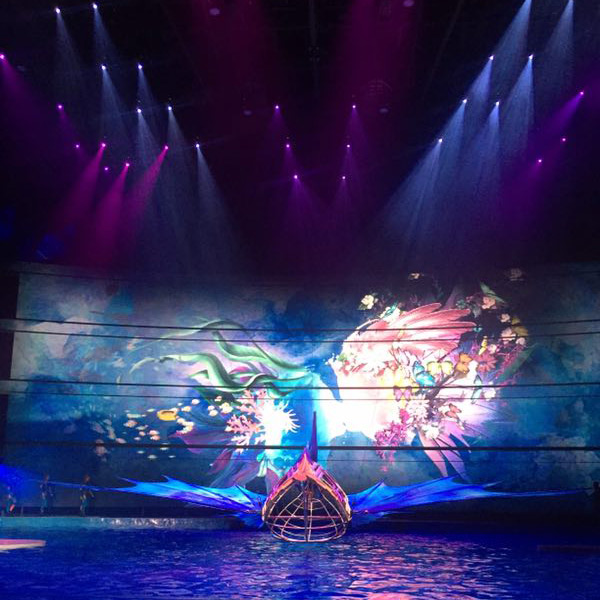 演出中,浩洋電子全能王三合一電腦燈G12HYBRID、切割燈V3000P、圖案燈V2500S、LED PAR燈A51-E近400臺專業舞臺燈光設備為現場助陣。浩洋燈光設備投射出炫目的燈光,與現場的煙霧、水面特效、無人機、各種大型自動化舞美機械在內的國際頂尖舞臺技術相互配合,融合水中芭蕾、空中藝術、花式跳水等眾多表演元素,共同呈現原創鉅制,還原了傳說中神秘古老的“亞特蘭蒂斯”世界。